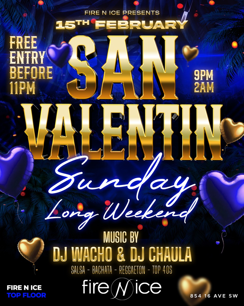 Join us Sunday, February 15th for SAN VALENTÍN 💙💘 The perfect way to enjoy Valentine’s Day weekend & the long weekend with Latin vibes all night long 💃🔥 🎶 Salsa • Bachata • Reggaeton • Top 40s 🎧 Music by DJ Wacho & DJ Chaula 💘 FREE entry before 11PM ⏰ 9PM–2AM 📍 Fire N Ice Bar & Lounge For general inquiries or reservations call (403) 605-1435